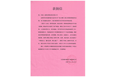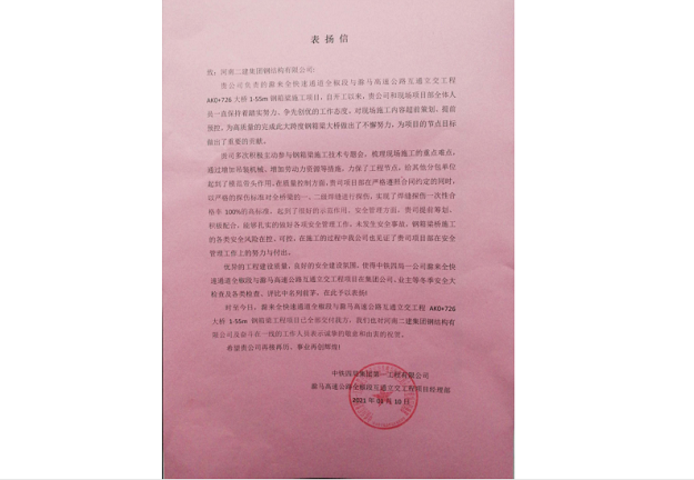 282021.01中鐵四局集團(tuán)第一工程有限公司向河南二建集團(tuán)鋼結(jié)構(gòu)有限公司發(fā)來表揚信 -