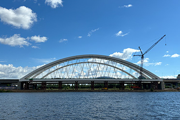 哈薩克斯坦阿斯塔納市輕軌一期伊希姆河鋼拱橋項(xiàng)目該拱橋位于哈薩克斯坦總統(tǒng)府旁,橋長155m,為下承式簡支系桿拱,主拱矢高2m,拱肋和主梁均采用鋼結(jié)構(gòu),拱肋采用鋼箱拱,主梁為鋼結(jié)構(gòu)縱橫梁體系。 -